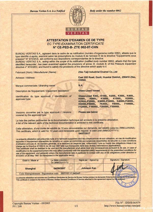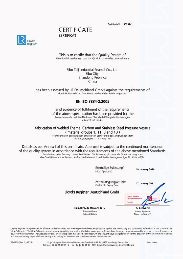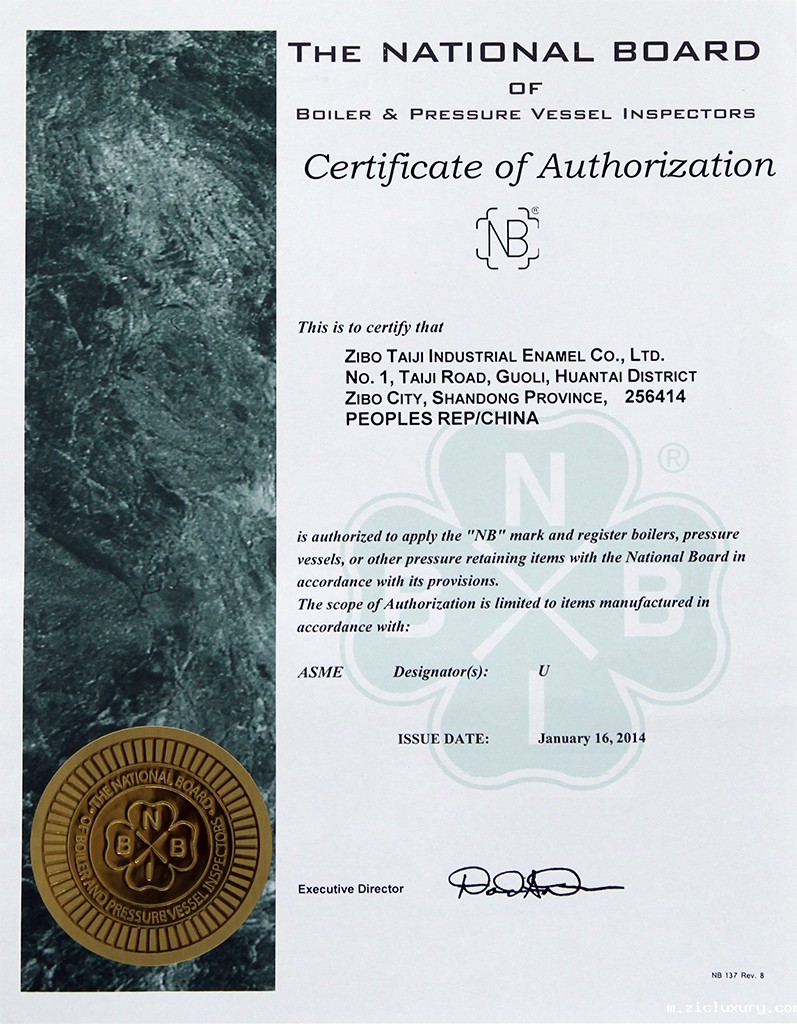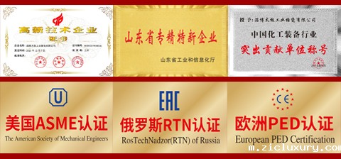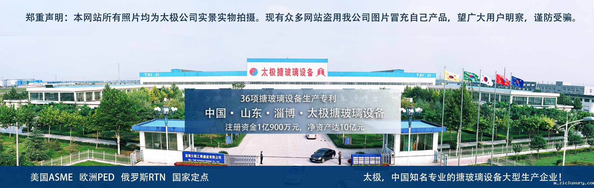 淄博太极在中国九游会ag登陆制造行业中首家通过ISO90001质量体系认证,并拥有美国ASME认证、欧洲PED认证以及国家部门颁发的搪玻璃制造许可证、进出口许可证和百余项荣誉证以及三十六项专利等。