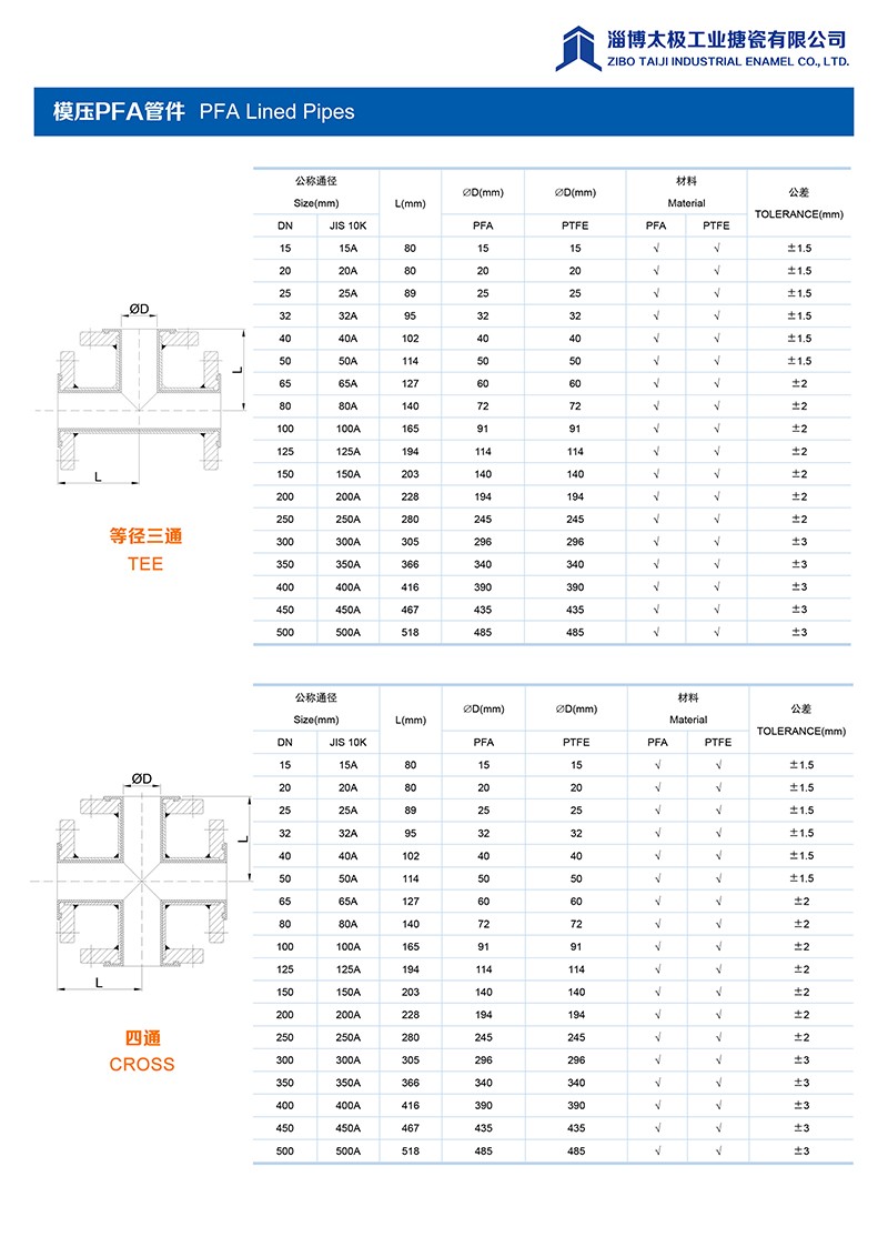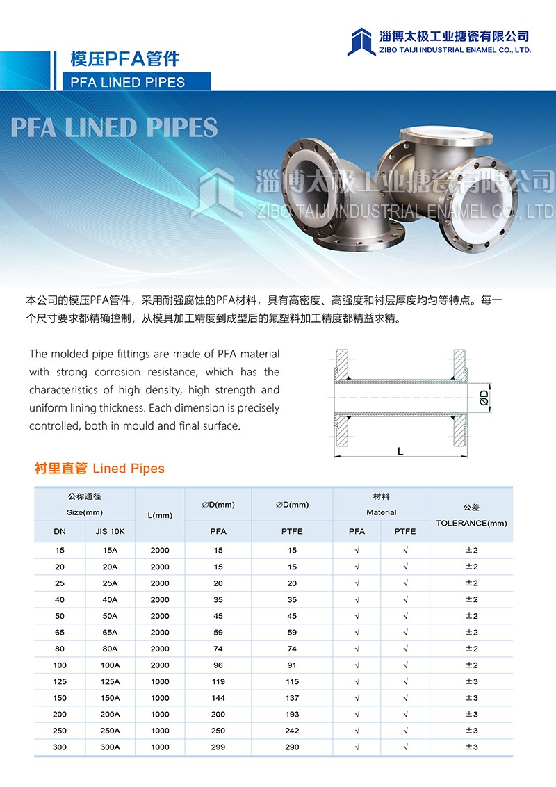 本公司的模压PFA管件,采用耐强腐蚀的PFA材料,具有高密度、高强度和衬层厚度均匀等特点。每一个尺寸要求都精确控制,从模具加工精度到成型后的氟塑料加工精度都精益求精。